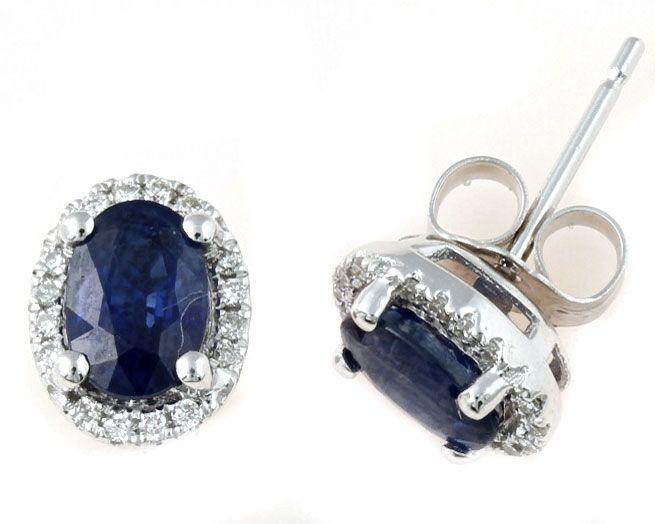 14k white gold sapphire and diamond earrings - 2 fine blue oval sapphires .91cts total - 28 round prong set diamonds .20cts total - push back friction posts