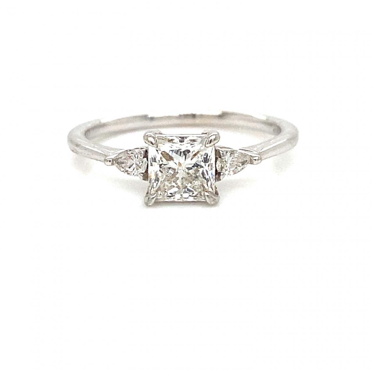 One ladies 14kt white gold princess cut and pear shaped diamond three stone engagement ring. Set into the center of petite claw prongs is one princess cut diamond. The princess cut measures 4.85-4.84x3.46mm with a loose weight of .70cts. Rated at E in color and VVS1 in clarity. GIA#6272048396. Flanking the center diamond is two pear shaped diamonds with a combined loose weight of .20cts.
