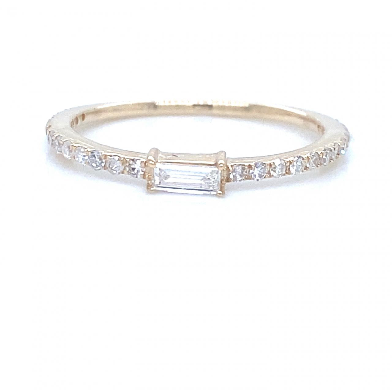 One ladies 14kt yellow gold diamond stacking ring. The ring is set with a straight baguette diamond measuring 4x2mm with a loose weight of .18cts. The ring is lined with round brilliant cut diamonds with a combined weight of .12cts.Ring is made in a size 6.75 but can be resized.