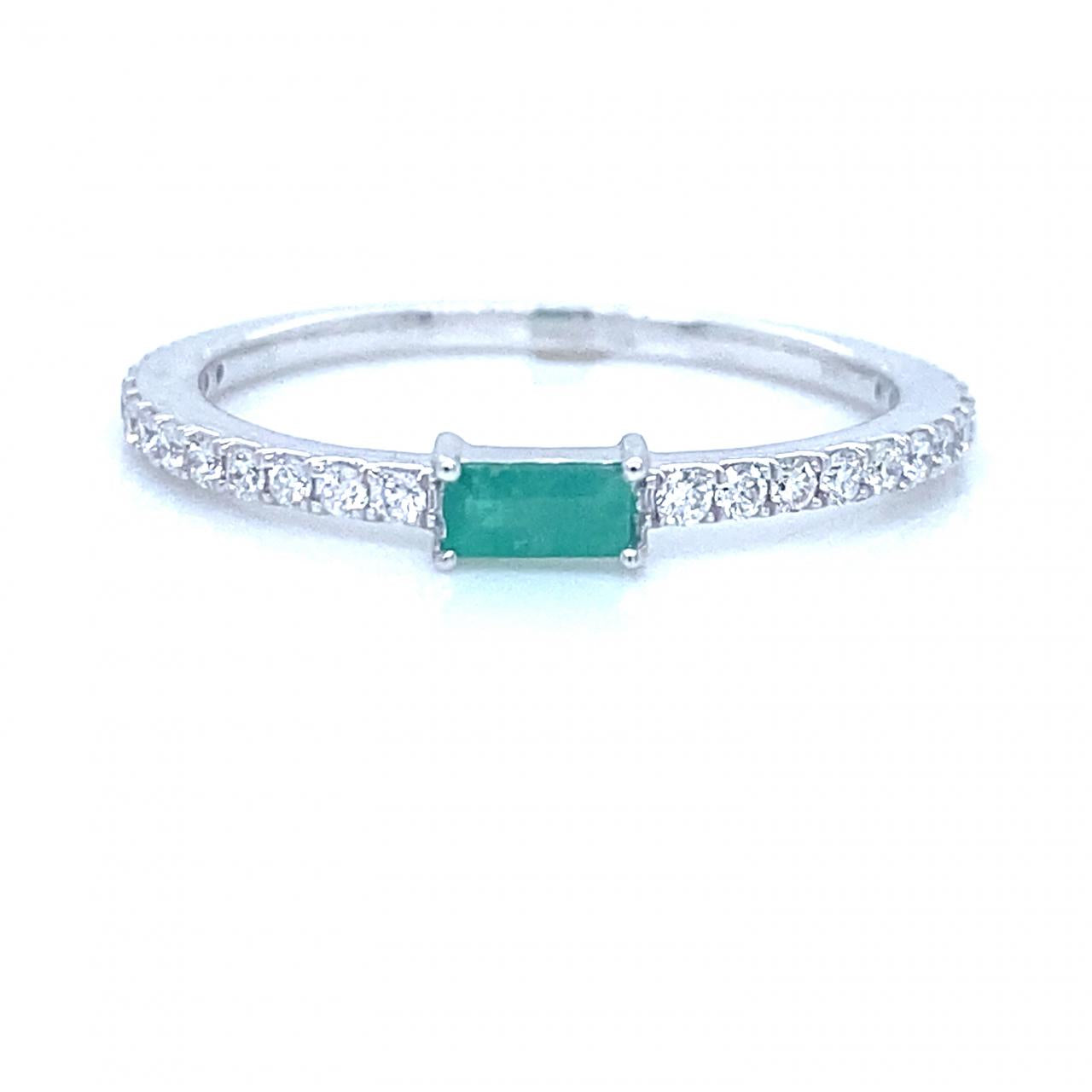 One ladies 14kt white gold emerald and diamond stacking ring. The ring is set with a straight baguette emerald measuring 4x2mm with a loose weight of .18cts. The ring is lined with round brilliant cut diamonds with a combined weight of .12cts.