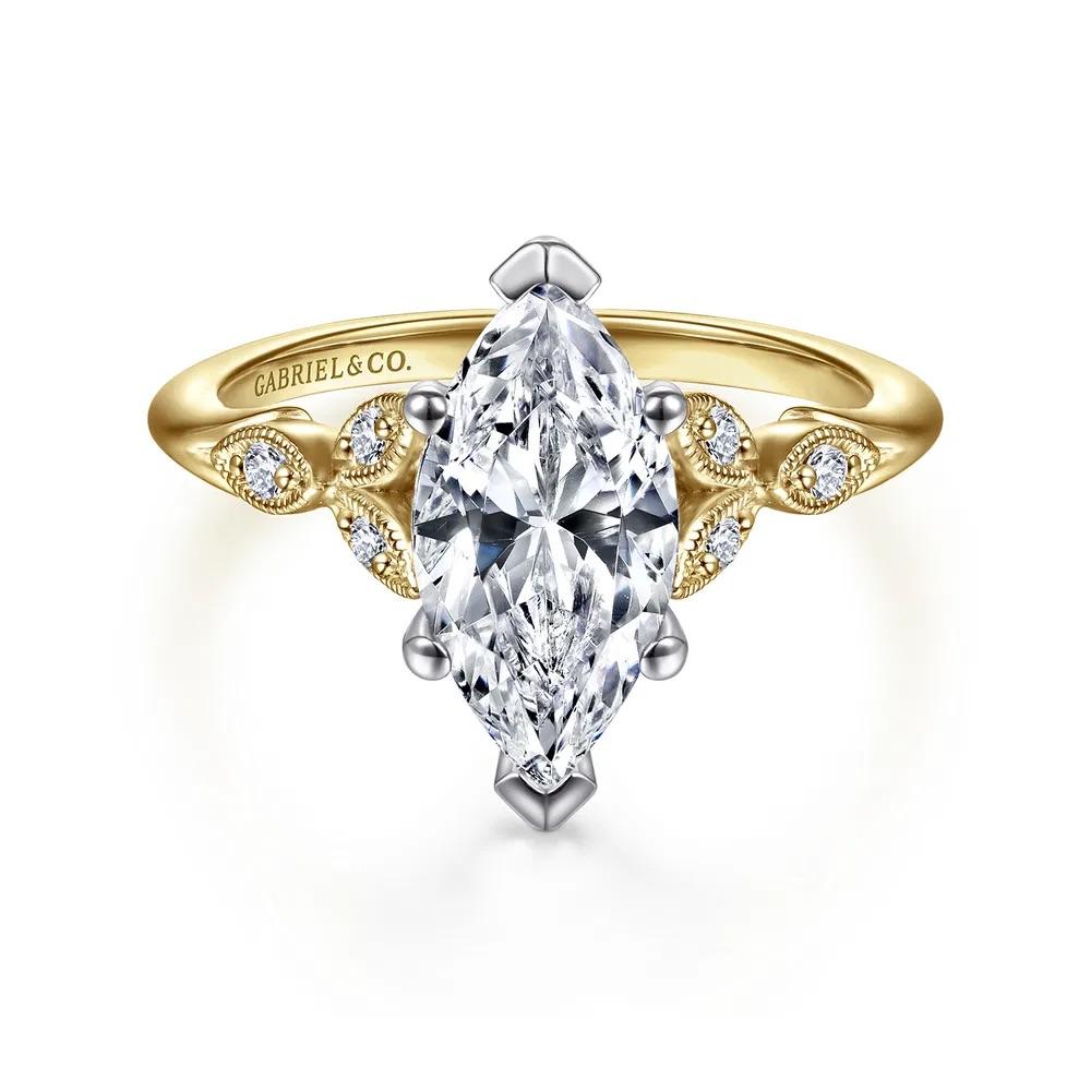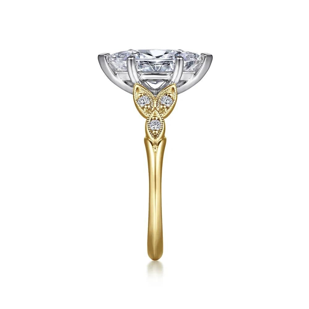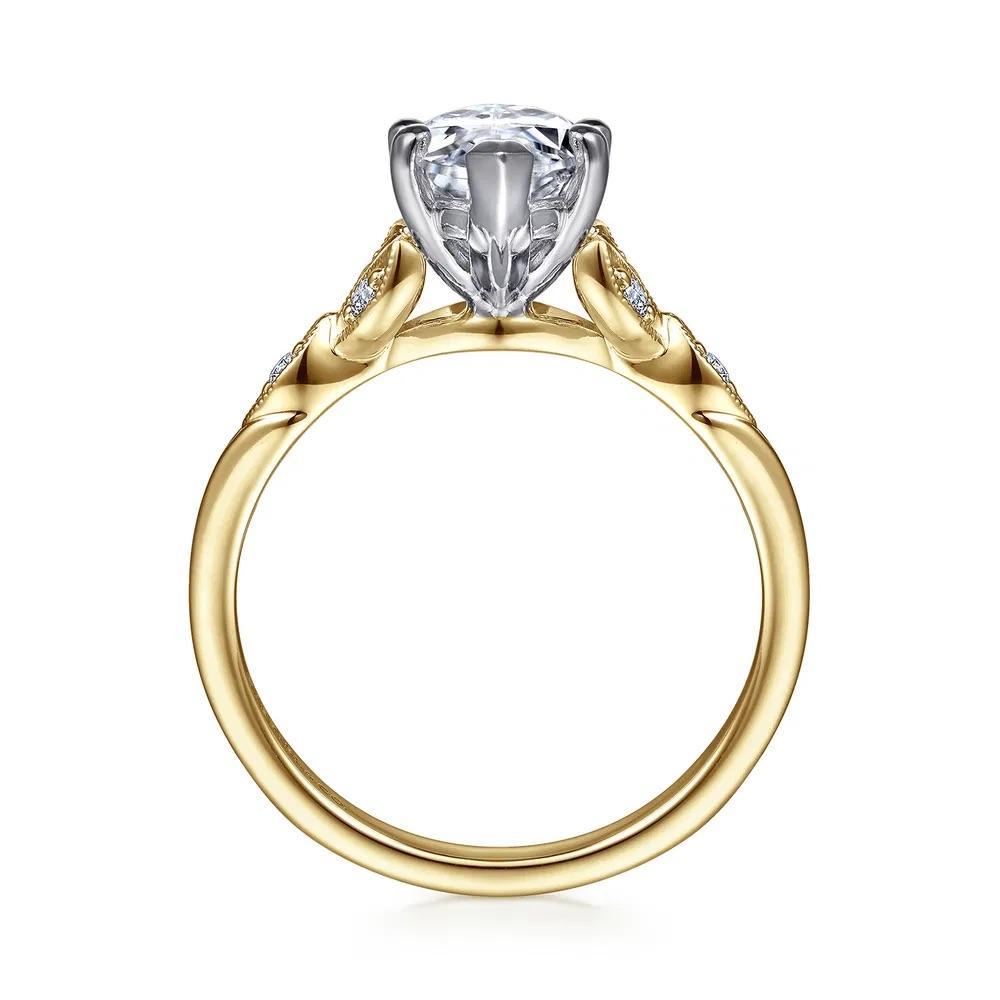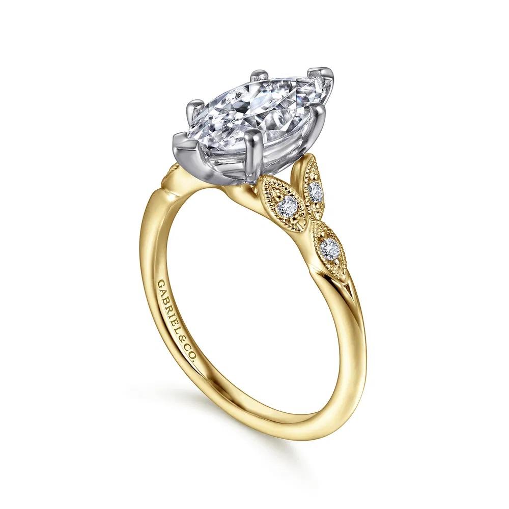 14K white gold 0.07cts of sparkle. Finished with a sculpted shank of polished 14K yellow gold, this setting radiates romance.
